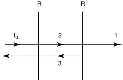 8.4 En kontinuerlig laserstråle, som kan betraktas som en plan våg inom stråltvärsnittet, har intensiteten och infaller i luft mot en förlustfri Fabry-Perot interferometer, se figuren nedan. Denna har plana, parallella plattor med reflektansen 0,95 hos de reflekterande ytorna, vilka har ett inställbart avstånd i luft.